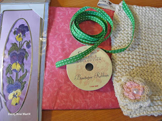 As well as the green ribbon around the parcel itself, there was a whole reel of beautifully patterned green ribbon, a handknitted cloth with a gorgeously delicate crocheted flower embellishment, and a quite fabulous embroidered bookmark.